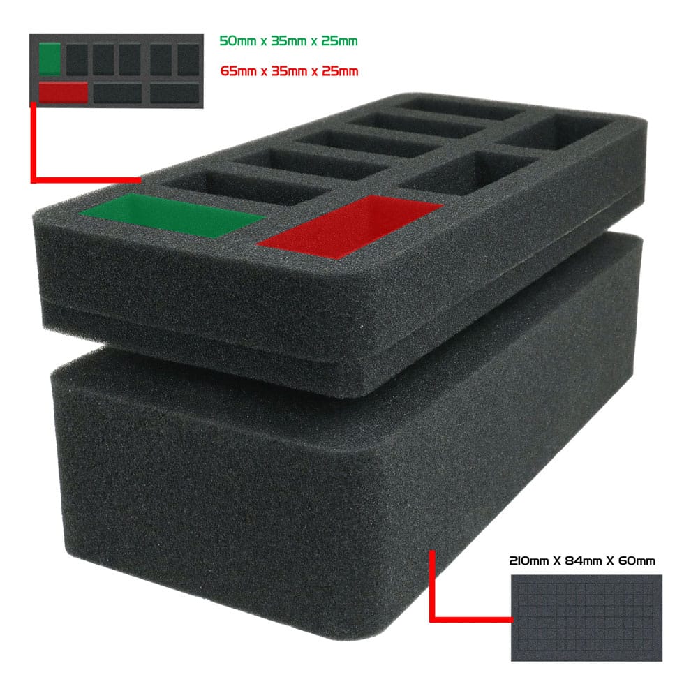 Miniatures Arsenal: House your collection of PCs, NPCs, monsters across integrated miniature foam trays: 9-slot tray (6) 50mm x 35mm x 25mm, (3) 65mm x 35mm x 25mm and a customizable foam tray.